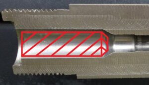 Piloted roughing drills allow you to remove large amounts of material from the chamber body area faster than with a roughing reamer. The red lines in the image on the right show what the drill can remove.